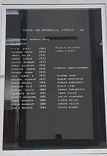The J. Robert Oppenheimer Memorial Prize and Medal was awarded by the Center for Theoretical Studies, University of Miami, from 1969, until 1984. Established in memory of US physicist J. Robert Oppenheimer, the award consisted of a medal, certificate and a $1000 honorarium. It was awarded for "outstanding contributions to the theoretical natural sciences [...] during the preceding decade".[1]