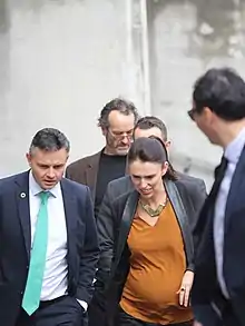 Ardern was unanimously elected as deputy leader of the Labour Party on 1 March 2017, after the resignation of Annette King. Exactly five months later, with an election due, Labour's leader Andrew Little resigned after a historically low opinion polling result for the party, with Ardern elected unopposed as leader in his place.[4] Labour's support increased rapidly after Ardern became leader, and she led her party to gain 14 seats at the 2017 general election on 23 September, winning 46 seats to the National Party's 56.[5] After negotiations, New Zealand First chose to enter a minority coalition government with Labour, supported by the Green Party, with Ardern as prime minister. She was sworn in by the Governor-General on 26 October 2017.[6] She became the world's youngest female head of government at age 37.[7] Ardern gave birth to her daughter Neve on 21 June 2018, making her the world's second elected head of government to give birth while in office (after Benazir Bhutto).[8]