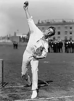 As a bowler, Crawford's technique was also orthodox,[100] although he was unusual in using his second and third fingers to spin the ball—most bowlers used their first and second.[132] His bowling pace varied from fast to medium,[2][7][48] and he spun the ball so much that his fingers snapped audibly as he released it.[133] An accurate bowler, it was difficult for batsmen to score runs against him.[2] Crawford could swing the ball away from the bat, but his most effective delivery was his off break: Clem Hill stated that Crawford could make the ball turn several inches, despite the hard pitches prevalent in Australia when he played there.[100] John Arlott described him as "the schoolboy genius who turned on Australian pitches where no one else deviated from straight".[134] In 1937, Herbie Collins wrote, at a time when Wally Hammond was considered to be the world's leading all-rounder, that "people who have seen both men consider [Crawford] a better all-rounder".[131]