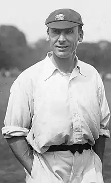 Hobbs toured Australia with the MCC during the 1920–21 season,[161] under the captaincy of J. W. H. T. Douglas, when Australia won every match of the five-Test series. He was one of the few English successes.[162][163] He scored two centuries in the opening three first-class games,[33] and in the first Test top-scored in both England innings with 49 and 59.[33][164] In the second Test, he scored 122 on a difficult pitch which had been affected by rain.[165] Wisden commented that this was "from the English point of view, the finest innings of the tour".[166] He also scored a century in defeat in the third Test, hitting 123 in the final innings as England failed to score 489 to win the game.[167] He did not pass 50 again in the series; after a failure on the fourth Test,[33] he tore a thigh muscle batting in a game before the final Test. Persuaded by Douglas to play anyway, he scored 40 and 34 but struggled to field effectively. One unsuccessful attempt to chase the ball caused some of the crowd to jeer him, which led to controversy when two amateur members of the team, Percy Fender and Rockley Wilson, wrote scathingly about the incident.[168] Hobbs scored a total of 924 first-class runs on the tour, at an average of 51.33;[38] in Test matches, he scored 505 runs at 50.50.[67] Although he and Rhodes resumed their opening partnership, apart from in the first Test, when C. A. G. Russell partnered Hobbs, they could not replicate their former successes,[169] and shared only one stand worth more than fifty.[169]