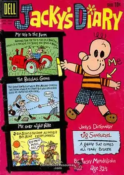 It purported to be the hand-illustrated, hand-written diary of a young boy, supposedly Mendelsohn himself in his extreme youth. Thus, it was both written and illustrated as though by a small child—which is not as easy to do as some who have had the misfortune of growing up might think. Week after week, Mendelsohn described trips to the circus, fishing expeditions, visits to members of his extended family, and all sorts of other adventures kids have, in a style simulating that of an actual kid—except, of course, for the fact that it was professionally rendered in every way. Unfortunately, professional work is sometimes best recognized by another professional, or at least by someone who knows what to look for—or at the very least, by someone who could see that this was a spoof, and that childishness was a schtick and not a natural state for Mendelsohn. King Features received complaints from those who didn't "get" it and thought the company was publishing the work of an actual child—or, in the case of those who noticed the byline ("by Jacky Mendelsohn, age 32½") by an adult whose abilities hadn't progressed since childhood. Often, parents, mistaking the strip's intent, would encourage their own children to send in submissions to what they thought was a kids' participation feature. But that's not why it folded quickly, Mendelsohn said in a later interview. It's simply that a Sunday-only comic is more expensive to produce than a daily, and King just couldn't afford it anymore.[3]