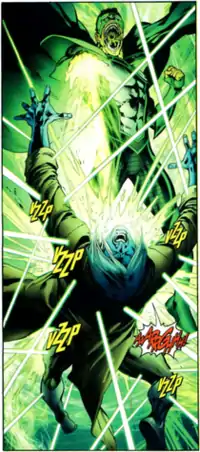 Chance and his fellow Lost Lanterns were all in the mess hall when the torchbearer Ion was whisked away by a yellow lantern ring during the Sinestro Corps attack on Oa.[8] Jack and a select few Green Lanterns were sent to Qward to rescue Hal Jordan and the Green Lanterns of Earth. While on Qward they discovered the Torchbearer Kyle Rayner was now possessed by the fear entity Parallax, which had turned him as murderous as Hal was. Jack then confronted Parallax and was forced to experience his repressed fear of an abusive family/childhood. The Parallax-possessed Rayner then killed Chance and crushed his ring.[9]