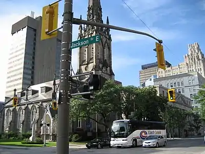 Jackson Street, is a Lower City collector road in Hamilton, Ontario, Canada. It starts off West of Locke Street South at Jackson Playground as a one-way street (Westbound) up to Queen Street South where it then switches over to a two-way street and is interrupted at Bay Street South the site of the Hamilton City Hall and the Canadian Football Hall of Fame (museum), resumes again East of the property on MacNab Street South and then ends at Wellington Street South.