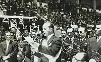 Prior to his death, Arana had planned to run in the 1950 presidential elections. His death left Árbenz without any serious opposition in the elections (leading some, including the CIA and US military intelligence, to speculate that Árbenz personally had him eliminated for this reason).[52] Árbenz had only a couple of significant challengers in the election, in a field of ten candidates.[50] One of these was Jorge García Granados, supported by some members of the upper-middle class who felt the revolution had gone too far. Another was Miguel Ydígoras Fuentes, who had been a general under Ubico and had the support of the hardline opponents of the revolution. During his campaign, Árbenz promised to continue and expand the reforms begun under Arévalo.[53] Árbenz was expected to win the election comfortably because he had the support of both major political parties of the country, as well as that of the labor unions, which campaigned heavily on his behalf.[54] In addition to political support, Árbenz had great personal appeal. He was described as having "an engaging personality and a vibrant voice".[55] Árbenz's wife María also campaigned with him; despite her wealthy upbringing she had made an effort to speak for the interests of the Mayan peasantry and had become a national figure in her own right. Árbenz's two daughters also occasionally made public appearances with him.[56]