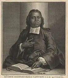 Jacobus Elisa Johannes Capitein (born ca. 1717; died 1747) was a Dutch Christian minister of Ghanaian birth who was one of the first known sub-Saharan Africans to study at a European university[1] and one of the first Africans to be ordained as a minister in the Dutch Reformed Church.[2] He is credited with spreading the use of the written word in his native Ghana.[3] Though a former slave, Capitein wrote a dissertation defending the right of Christians to keep slaves.
