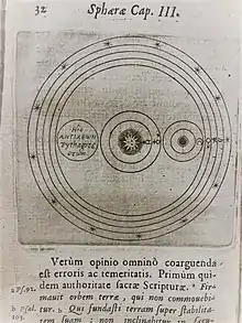 Du Chevreul rejected the Copernican theories on the system of the universe for many reasons. First, he believed that the Earth was at the center of the universe and did not orbit. He used the teachings of Plato, Aristotle, and other philosophers and astrologers who asserted this geocentric idea and cited Plato in the Timaeus and Phaedo and Aristotle in the De caelo.[1] Second, he looked to passages in the Bible for theological support. One passage stated that when God created the Earth, he did not intend for it to move. Another passage referenced the miracle witnessed by the biblical character Joshua in which God halted the movement of the sun and the moon. The use of Biblical Scriptures was consistent with the 1616 condemnation of Copernicanism by the Catholic Church as well as du Chevreul's own views on religion and astronomy.[1] Du Chevreul also argued that Copernicus's theories were inconsistent with the physics concerning the motion of a simple body because Copernicus believed the simple body- the Earth- would have two motions however simple bodies can only have a single and simple motion. Even though he claimed that Earth was at the center of the universe, du Chevreul also claimed that Venus and Mercury orbited the Sun. The root of this theory was his claim that spots seen on the Sun are actually Venus and Mercury rather than the fact that they have phases like the moon.[1]