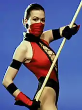 Jade debuted in Mortal Kombat II as a green palette swap of Kitana with darker skin and gold-tinted duplicates of her steel fans. Ed Boon said she was initially just "an evil version of Kitana, in a sense."[24] While the game was in development, the team wanted to add a secret character based on Katalin Zamiar, who had already been filmed performing as Kitana and Mileena; Jade was created in what Zamiar described as a mostly "on the spot" fashion.[25] Zamiar's outfit used for filming the female ninja characters was blue,[26] and presented some challenges for the actress during filming, such as the bottoms of the leggings being a bit too slippery for moves such as jump kicks[27] and the tops having to be held up with rubber bands, while her mask was taped to her nose to keep it in place.[26] Zamiar did not return for Ultimate Mortal Kombat 3 due to brewing legal issues with Midway,[28] and was replaced by Becky Gable.[29] At that point, Jade was given a staff weapon to further separate her from Kitana and Mileena.[24] In UMK3 and subsequent titles where the three of them appear, while Mileena's skin color is sometimes mildly darker than Kitana's, Jade's skin is consistently the darkest of the three. In the 2011 reboot game, Jade can have classic palette-swapped outfits from the 1990s as some of her alternate costumes; there is even a secret special encounter battle against her wielding Kitana's fans just like in Mortal Kombat II.[30]