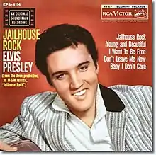 Jailhouse Rock is an EP by American singer Elvis Presley, featuring songs from the movie of the same name. It was released by RCA Victor, with catalogue EPA 4114, on October 30, 1957. Recording sessions took place at Radio Recorders in Hollywood on April 30 and May 3, 1957, with an additional session at the Metro-Goldwyn-Mayer Soundstage in Hollywood on May 9 for "Don't Leave Me Now".[2] It peaked at #1 on the newly inaugurated Billboard EP chart where it remained at #1 for 28 weeks. The EP album was the best selling EP album of 1958 according to Billboard.[3]