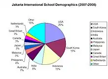 Jakarta Intercultural School is the largest international primary and secondary school in Indonesia, enrolling 2,469 students from 61 nationalities during the 2007–2008 school year.[14][15] The five most commonly represented nationalities were the United States, Republic of Korea, Indonesia, India, and Australia.