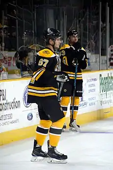 Leading up to the 2015 NHL Entry Draft on 26 June 2015, Zbořil was named as a top-rated prospect and was widely projected to be a first round selection at the draft.[3][4] He was ultimately selected by the Boston Bruins with the 13th overall pick, acquired from the Los Angeles Kings in exchange for Milan Lucic, one of three consecutive first-round selections by the Bruins, along with Jake DeBrusk (14th overall) and Zachary Senyshyn (15th overall). On 15 July, Zbořil signed a three-year, entry-level contract with the Bruins.[5] It would not be until the 2018–19 season, with a depleted defensive corps at the time, that Zboril would play his first NHL game with the Bruins – Zboril's first game with the Bruins occurred on 17 November 2018, in a 1–0 overtime road loss to the Dallas Stars.[6] However, he only appeared in two games for the Bruins that year before returning to the minors.