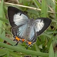 Jalmenus evagoras, the imperial hairstreak, imperial blue, or common imperial blue, is a small, metallic blue butterfly of the family Lycaenidae. It is commonly found in eastern coastal regions of Australia.[2] This species is notable for its unique mutualism with ants of the genus Iridomyrmex. The ants provide protection for juveniles and cues for adult mating behavior. They are compensated with food secreted from J. evagoras larvae. The ants greatly enhance the survival and reproductive success of the butterflies. J. evagoras lives and feeds on Acacia plants, so butterfly populations are localized to areas with preferred species of both host plants and ants.[3]