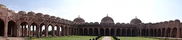 The fort is one of the finest examples of Afghan architecture in India.[6] The main entrance of the mosque is through the eastern entrance. The entire area of the mosque is 7,744 square metres (83,360 sq ft), built on an elevated platform 4.6 m (15 ft). The inscriptions on the eastern doorway to the porch indicates that the mosque was modeled on the basis of Mosque of Damascus.[7] The doorway also has marble jambs and lintels which are atypical of Hindu structures. The entry via eastern entrance leads to a large courtyard interspersed with colonnaded verandas on the three sides. The pillared verandas leads to the prayer halls which is covered with pillars with 58 small domes and three large domes. The prayer hall is full of arches. The central altar (called mihrab) is decorated with verses from Quran. The raised pulpit at the centre has a miniature pulpit made of marble. There are two entrances in the northern wall, one leading to the courtyard and other to the prayer hall.[8]