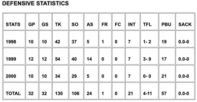 Oregon...Made the Ducks regret that he was eligible for this contest, as he picked off three of QB Joey Harrington's passes for a total of 58 yards in returns, deflected 5 other passes and made 3 solo tackles...Also saw action as a receiver, but did not catch any passes.