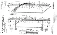 The Melan bridges that were built by Marsh and others required royalties to be paid to the American holders of the patent. The added cost of paying royalties made the cost of building such bridges with reinforced concrete very high. Marsh did not want to pay the royalties, so he built his own design for a reinforced concrete highway bridge, which later became known as the Marsh Rainbow Arch. His rainbow arch bridges were designed to be built without any supporting scaffolding. On August 12, 1912, Marsh received a patent for the design. The design used less labor, and it used a lesser amount of concrete. Steel that would be used for reinforcing bridges was cheap. Marsh's patented work allowed rural townships to have bridges that resembled the ones used over rivers in bigger cities.[1] The patent was described as being "to construct an arch bridge of reinforced concrete in such a manner as to permit a limited amount of expansion and contraction both of the arches and of the floor".[2]