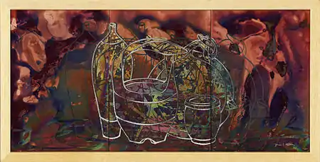 James C. Watkins (1951 - ) was born in Louisville, Kentucky, in 1951 and raised in a farming family in Athens, Alabama.[1] He is a ceramic artist living in Lubbock, Texas who has worked with clay for over 40 years. He is known for his large scale double-walled ceramic vessels and laser cut porcelain substrate [2] tiles. He is recognized for his textured surfaces, created by using alternative firing techniques.[3] His porcelain substrate tiles are fumed [4] with stannous chloride and multi-fired using ferric chloride, gold and platinum luster to achieve colorful surfaces.[5]