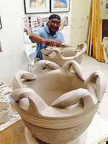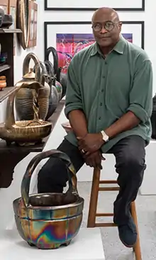 Watkins uses his experience of growing up in the rural south during the 1950s and 60s as a source of inspiration for his signature work. His mother and father were farmers. Watkins is the oldest of six children - three boys and three girls. He grew up in a time when large cast-iron pots were still used as an essential farming utensil.[15] His mother made soap, hominy and souse in the large black cast-iron pots. Watkins creates large double-walled ceramics forms that are inspired by the memory of helping his mother keep the fire burning hot around the cast-iron pots.[16]