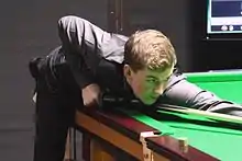 In the first round of the championship, Cahill drew world number one and five-time champion Ronnie O'Sullivan. Cahill led 5–4 after the first session of the match and won three of the four frames at the start of the next session to lead 8–5. O'Sullivan won the following three frames to tie the match at 8–8 before Cahill won the final two frames and the match 10–8.[38] After beating O'Sullivan, Cahill commented "I am over the moon, to beat the best player in the world and hold myself together on my Crucible debut."[39] The match was referred to as the "biggest shock in Crucible history" by the British Broadcasting Corporation, with master of ceremonies Rob Walker introducing him as "the giant killer" for having defeated two world number ones as an amateur.[40][41][42]