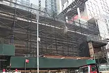The western annex, measuring 35 feet (11 m) wide, is being built between 2021 and 2022.[11][12] The annex will be about 74 feet (23 m) tall, with five stories; the elevator shaft in the annex will rise to 80 feet (24 m). A recessed brown-granite bay at the end of the alley will connect the annex and original theater.[21] The annex's elevator shaft will be about 30 feet above the roof of the original theater.[22] Unlike the original facade, it will have a modern design with cream-colored terracotta facade panels interspersed with polished brownstone pieces.[14][23] There will be glass display boxes at ground level, as well as a glazed window at the eastern corner of the annex's upper stories.[24] There will also be an LED sign on the exterior of the annex's upper stories.[22][25]