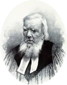 There were others besides the Senatus Academicus of Glasgow who felt it an honour to themselves to honour the face of the old man. Thomas Guthrie and his son, the minister of Liberton Free Church, paid a visit to Dr Ingram in 1871, and greatly cheered the heart of their venerable friend by their genial company and conversation. On his return to Edinburgh, Dr Guthrie set about the raising of a subscription for a portrait of Dr Ingram, and Mr Otto Leyde went to the Free Church Manse of Unst to execute the commission assigned to him. He succeeded in producing a characteristic likeness, life size, and the portrait having been presented to the Free Church, once adorned the walls of the Common Hall of the New College, Edinburgh. A smaller replica of this canvas was taken by the artist, and, along with a silver tea service, was presented to Dr Ingram, to be preserved as an heir-loom in the family.[1][9]
