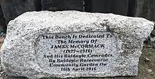 In civilian life, James McCormack's expertise was in the envisaging, fabrication and maintenance of racecourses—at Bellewstown Racecourse and later Baldoyle Racecourse, both renowned. In 2016, a one hundred-year commemorative plaque and park bench were dedicated in his name at the Baldoyle Racecourse Community Garden. Many of his descendants still living in Baldoyle/Sutton/Howth area, and from further afield, were able to attend this 2016 memorial and plaque installation.