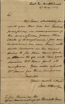 He was paroled in January 1777, then released from parole in March 1778. Having sufficiently impressed George Washington, he was appointed aide as secretary to the commander-in-chief in May 1779. McHenry was present at the Battle of Monmouth. In August 1780, he was transferred to Lafayette's staff, where he remained until he retired from the army in the autumn of 1781.[4][5]