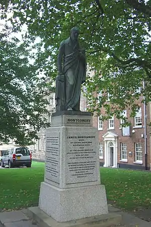 In 1861, a monument designed by John Bell (1811–1895) was erected over his grave in the Sheffield cemetery at a cost of £1000, raised by public subscription on the initiative of the Sheffield Sunday School Union, of which he was among the founding members. On its granite pedestal is inscribed: "Here lies interred, beloved by all who knew him, the Christian poet, patriot, and philanthropist. Wherever poetry is read, or Christian hymns sung, in the English language, 'he being dead, yet speaketh' by the genius, piety and taste embodied in his writings." There are also extracts from his poems "Prayer" and "The Grave". After the statue fell into disrepair it was moved in 1971 to the precincts of Sheffield Cathedral, where there is also a memorial window to him.