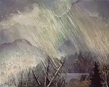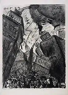 In 1911, he achieved a feat that was out of reach for most beginning artists when Louis Katz gave him a solo exhibition at his eponymous commercial art gallery on West 74th Street in Manhattan.[note 6] An equally unlikely outcome was a long and appreciative review of this exhibition in the Brooklyn Daily Eagle. Crediting Rosenberg with a "poetic sense," the paper's critic said the 40 pastels in the show were "sensitive and quietly impressive rather than bold and big in style, color," and added, "the subtle handling of themes are important points in the work." This critic went on to give favorable appraisals of many works by name, writing, for example, that "'Jamaica Bay, Emerald and Mauve,' shows a remarkable scenic effect, with its green-shot water and mauve areas. There are some evening effects with lights of big hotels along the shore, piercing the remembrance of sunset in the sky."[63] A critic for the New York Times was also impressed by the show, saying the pastels were "refined in color and show[ed] a vision sensitive to beauty." Of two of them, this critic wrote, "'Wet Street,' is a poetic transcription of a scene many times noted by the artists of the city, and 'Steam and Mist' is another successful version of the mysterious and exquisite effects with which New York clothes her medley of architecture."[67] In 1913, Rosenberg received a second solo exhibition of pastels, this time at the Arlington Art Galleries in Brooklyn, and, once again, the works displayed received favorable critical notice.[note 7] One critic praised a "refinement and practiced hand" and another said the pictures had "refined color and much feeling for nature."[69][70] A third critic was almost effusive, writing, "Many men aim at poetry through the medium of pictorial art, but it is not often they achieve the lyric bays so truly as this painter has done in this little group of pastels."[71][note 8] In 1916, he contributed a painting to the annual exhibition of the New York Water Color Club.[72] In 1917, he exhibited in the first group exhibition held by the Society of Independent Artists.[73] The following year he showed pastels at the Anderson Galleries with all proceeds from sales to be donated to the Red Cross.[note 9] The show included landscapes and still lifes. A critic for the New York Tribune praised one of the former, "Scattering Clouds," as a "strong piece of work" revealing "deep blue mountains" against an "exquisite turquoise sky."[75] In 1921, he showed with Marsden Hartley at the Anderson Galleries.[64] The following year Rosenberg helped found a gallery called The New Gallery (and was called one of the gallery's "leading spirits and godfather").[8][76] The gallery was financed in part by an innovative scheme, the New Gallery Club, begun in February 1923. The club supported the gallery through its membership fees and it raised funds and publicized exhibitions by means of entertainments, teas, and receptions. Many club members were amateur artists whose work the gallery showed in special exhibitions.[77] In 1924, Rosenberg showed three paintings in a group exhibition at the gallery.[76] Four years later, he held a solo exhibition of Adirondack Mountain landscapes at the Erich Galleries.[65][note 10] At that time he told an interviewer that he painted simply for the joy of it. He said, "I have no suppressed longing to live in the South Seas and do nothing but paint. And I have no 'message' to give the world. I happen to be very fond of the Adirondacks, and my summer home is located among them."[65] His painting, "Adirondack Cloudburst," of 1946 (shown at right) is one of many mountain landscapes he made in the course of his career. In 1928, he contributed two paintings to a group exhibition of the Salons of America at the Anderson Galleries.[80][note 11] In 1929, Rosenberg departed from the style of painting and subject matter of his earlier work when he produced what turned out to be his best-known piece, a lithograph called "Dies Irae" (Day of Wrath), showing the October 29, 1929, Wall Street Crash as a horrific scene of destruction. On January 12, 1930, the New York Times put a reproduction of the lithograph on the front page of its Sunday magazine.[82] "Dies Irae" is shown at left.