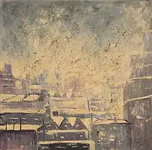 Rosenberg's art is representational. Called a "romantic realist," he adopted Paul Cézanne as his model and explicitly rejected the New York art world's shift toward abstraction in the late 1940s.[96] In a 1959 interview he acknowledged that his style was no longer fashionable and said he was content to serve the needs of his art in his own way. More than that, he disdained the "contemporary avalanches of abstract paintings" and said abstract artists had "nothing new to communicate."[95] He made pastels and oils throughout his career. Beginning in the 1920s he made lithographs and late in his career he made at least one montage. He made landscapes, particularly of scenes from the Adirondack Mountains, where he owned extensive property, but also of scenes from places where he traveled on vacation or business. These paintings were said to show a strong feeling for the natural environment and were seen as refined rather than exuberant.[69][95] He made cityscapes. One example of the latter is an oil called "New York in Snow," shown at right. And he chose current events as his subjects. These include celebrations, such as an early pastel, "Victory Parade—Return of the 27th Division, AEF, 1919" and a late pastel, "March Parade of Colonel John B. Glenn (New York City, March 1, 1962)," but they also include the prints he made showing tragic events, both real (such as the 1929 stock market crash) and imaginary such as the devastation that would be caused by atomic warfare).[90] He preferred to paint in a studio using sketches made outdoors. "I see too much when I try to paint from the subject itself," he once said.[96]