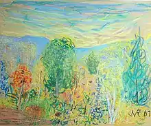 When Rosenberg retired from his law practice in 1947, he began a practice of donating works from his collection and proceeds from exhibition sales to charitable causes. In that year, he was given a solo exhibition at the Wildenstein Galleries. Howard Devree, a critic for the New York Times, who had briefly criticized Rosenberg's 1943 exhibition as "earnest" but "not very impressive," gave this show a long and quite favorable review.[89] He noted that some of the paintings had been loaned by private collectors and others by prominent museums, including the Boston Museum of Fine Arts, and that W. G. Constable of the Boston Museum had written the foreword to the accompanying catalog. Devree said "Mr. Rosenberg's painting is never pretentious or sensational. The play of light, the fleeting mood of a landscape, always such challenges to the artist, he strives to capture simply—not by literal transcription but with a warmly understanding interpretation."[90] On passing the age of 80 in 1954 he continued to paint and exhibit, including a show of work made during the trip he made to Israel to meet with Ben Gurion and others.[91][92] Regarding one of these shows, a New York Times critic, Stuart Preston, praised the emotional power of his mountain landscapes and his landscapes showing the devastation that he imagined would result from atomic war, but he was less enthusiastic about their artistic value.[note 15] He wrote, "The very humanity of Rosenberg's feelings goes far to excuse the esthetic shortcomings of the paintings."[94]