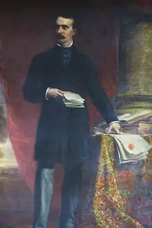 On December 21, 1879, James Prendergast, 31, a prominent lawyer and grandson of the founder of Jamestown, unexpectedly died in Buffalo, NY, while being treated for an illness.[8] He had begun to write a will, but it was not complete when he died.[9] While arranging James' business affairs, his business partner, Eleazer Green, discovered a memorandum[10] that James wished the income from his business interests, the Prendergast block, be used to establish a free library in Jamestown.[11][12][13] On January 1, 1880, eleven days after his death, It was announced that James' parents, Alexander and Mary Prendergast, had already taken steps to ensure that their son's wishes would "be carried out to the every letter."[14]