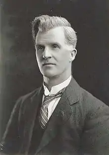In 1910 Scullin won his first election as the Labor candidate in Corangamite, in a year when Labor's Andrew Fisher surged in the polls and formed Australia's first majority government.[16] Scullin had done much to personally build the grass-roots organisation of the Labor movement in this seat in the years prior to the election, although its rural character meant it was not considered a seat naturally sympathetic to Labor.[17] His campaign focused on increasing the powers of the Federal parliament and issues such as defending a white Australia, higher import duties and the introduction of a land tax.[17] In federal parliament, Scullin quickly earned a reputation as an impressive and formidable parliamentary debater. He spoke on a wide range of issues over the three years of his term, but concentrated especially on matters relating to taxation and the powers of the Commonwealth, both of which would become signature issues for Scullin throughout his career.[8] By the end of his first year in parliament he had a reputation as "one of the most ardent land-taxers in the Labor party"[18] and had spoken frequently on breaking up "the land monopoly which has for so many years retarded the growth of this young country."[19] Scullin enthusiastically supported Fisher's referendum questions in expand Commonwealth power over in 1911 and again in 1913, though in both cases all amendment proposals were rejected by comfortable majorities.[20] Although he was well regarded in his district and hard-working and ardent, it was not enough to shield him from Joseph Cook's resurgent and now united conservative forces in the election of 1913, and Scullin suffered the fate of many Labor members in rural districts at that year's election.[21] He tried and failed to reacquire the seat at the 1918 Corangamite by-election.