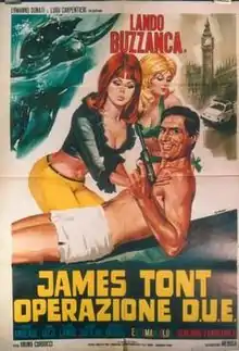James Tont operazione D.U.E. or The Wacky World of James Tont is a 1966 French/Italian international co-production spy film spoof based on James Bond's Thunderball and featuring elements predating the release of You Only Live Twice. Directed by Bruno Corbucci, the Eurospy spy-fi comedy adventure is the sequel to James Tont operazione U.N.O. (1965) with Lando Buzzanca repeating his role as 00 Agent James Tont, a satire of James Bond and Loris Gizzi as the black monocle wearing supervillain spoof of Emilio Largo.