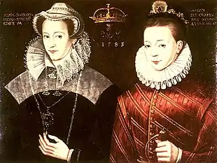 James (right) depicted aged 17 beside his mother Mary (left), 1583. In reality, they were separated when he was still a baby.