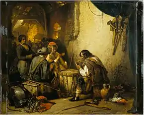 Many of the paintings from this period depict specific historical subjects, while others were genre scenes or portraits. This development towards Realism made him one of the pioneers of this artistic movement in Belgium.[3] The painting Wedding in Flanders in the 17th century (1839; Royal Museum of Fine Arts Antwerp) was the first to herald this more sober style. His works from the 1640s attest to Leys' search for historical and psychological truthfulness, which replaced the emphasis on pathos and sentimental anecdote of his earlier work.[3] An example of his works that abandoned historical legend in favour of a realistic depiction of historical events is the composition Albrecht Dürer visiting Antwerp in 1520. Leys based this picture on the account given by Dürer in his own journal of the event.[10] In his scenes of 16th and 17th-century Antwerp, Leys sought to reflect the spirit and atmosphere of that time. His compositions of historical events and of everyday life were realistic and may have been inspired by contemporary French Realists Gustave Courbet and Jean-François Millet.