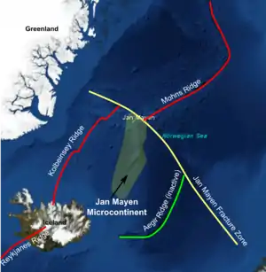 The microcontinent extends about 500 km southwards from the Jan Mayen fracture zone. It is up to 160 km wide.[1] The Jan Mayen Ridge separates the Norwegian Sea (the Norway Basin) from the Greenland Sea.[2]