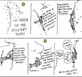 During World War II, Herb served as an electrical engineer for the Navy Department in Washington, DC.[7] Jan and Herb spent their spare time exploring the rocks surrounding Washington DC, most notably Carderock where they began climbing in 1942. They climbed and named many of the routes at Carderock, including Herbie’s Horror, Jan's Face, Spider Walk and Ronnie's Leap, which was named after their dog.[12] Herbie’s Horror, first climbed by Herb, was one of the first 5.9 routes in the eastern United States.[13] They also made the first documented ascents of the routes Conn's East and Conn's West at Seneca Rocks,[14] following the pitons left by the mountain troops who trained there. In a letter to the Potomac Appalachian Trail Club Mountaineering Section the Conns describe a visit to Seneca with Don Hubbard: "Don and the two of us climbed the south peak on a gorgeous moonlit evening, carrying sleeping bags, and spent the night on the narrow summit ridge. Don woke up in the night to see the lower half of Jan’s bag flapping over the edge. But Jan was safely curled up in the top half, still anchored to a piton in the rock."[14] In 1944 they started publishing "Up Rope" magazine, which became the official newsletter of the Mountaineering Section of the Potomac Appalachian Trail Club (PATC).[2][15][16][17]