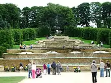 A practising martial arts enthusiast, she introduced cage boxing to The Alnwick Gardens and a range of cocktails named after her.[2][25] The Duchess, who claims to defy tradition,[2][8][10] has received praise and scorn for The Alnwick Gardens, but has dismissed criticism as "the snobbery element of gardening".[8] The locals welcomed the restoration and the influx of tourists,[26] while English Heritage accused the Duchess of destroying one of the greatest gardens in England.[9] In 2004, she was hospitalised after collapsing under pressure, and the criticism made her consider resigning the trusteeship and giving up on the project.[3]