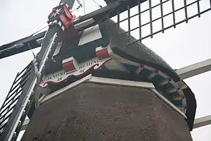 There has been a windmill on this site since 1652. This first mill was a post mill, which from 1740, when it was bought by Willem Helling, was owned by the Helling family. In 1835, a new smock mill was built by Willem Helling's grandson, also named Willem Helling.[2] This was a corn and barley mill, and much larger than the original mill. Willem Helling died in 1863 and the mill passed to his son Klaas, whose wife gave birth in 1863 to a daughter, Jantiena. Klaas died in 1865 and Jantiena's mother remarried. In 1890, the mill burnt down during a thunderstorm.[3]
