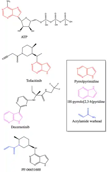 JAK3 inhibitors target the catalytic ATP-binding site of JAK3 and various moieties have been used to get a stronger affinity and selectivity to the ATP-binding pockets. The base that is often seen in compounds with selectivity for JAK3 is pyrrolopyrimidine, as it binds to the same region of the JAKs as purine of the ATP binds.[15][1] Another ring system that has been used in JAK3 inhibitor derivatives is 1H-pyrrolo[2,3-b]pyridine, as it mimics the pyrrolopyrimidine scaffold.[16]