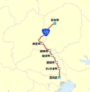 National Route 122 is a national highway of Japan connecting Nikkō, Tochigi and Toshima, Tokyo in Japan, with a total length of 158.3 km (98.36 mi).