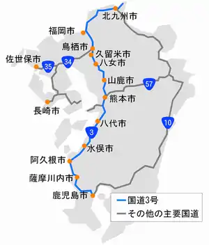 National Route 3 (国道3号, Kokudō San-gō) is a major highway on the island of Kyūshū in Japan. It connects the prefectural capital cities of Kagoshima (Kagoshima Prefecture, Kumamoto (Kumamoto Prefecture), and Fukuoka (Fukuoka Prefecture), passing through Kurume as well.