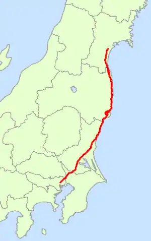 Major cities and villages it passes through include: Kashiwa, Toride, Tsuchiura, Ishioka, Mito, Hitachi, Iwaki, Tomioka, Ōkuma, Sōma, Watari, Iwanuma