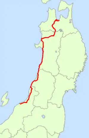 The main line of National Route 7 has a length of 471.8 kilometers (293.2 mi). When bypasses signed as National Route 7 are included, its total distance increases to 559.6 kilometers (347.7 mi).[2] The highway's origin and southern terminus lies in Chuo-ku, Niigata at junction with national routes 8, 17, 113, 116, 289, 350, and 402. The highway passes through Shibata, Murakami, Tsuruoka, Sakata, Yurihonjō, Akita, Noshiro, Ōdate, and Hirosaki. Its endpoint and northern terminus lies in Aomori at a junction with national routes 4 and 45.[3]