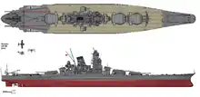 Musashi (武蔵), named after the former Japanese province,[2] was one of three Yamato-class battleships[N 1] built for the Imperial Japanese Navy (IJN), beginning in the late 1930s. The Yamato-class ships were the heaviest and most powerfully armed battleships ever constructed,[4] displacing almost 72,000 long tons (73,000 t) fully loaded and armed with nine 46-centimetre (18.1 in) main guns. Their secondary armament consisted of four 15.5-centimetre (6.1 in) triple-gun turrets formerly used by the Mogami-class cruisers. They were equipped with six or seven floatplanes to conduct reconnaissance.