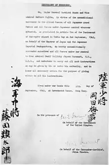 On 16 September 1945, Harcourt formally accepted the Japanese surrender[19] from Maj.-Gen. Umekichi Okada and Vice Admiral Ruitaro Fujita at Government House.[56]