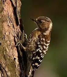 The Japanese pygmy woodpecker or pygmy woodpecker[3] (Yungipicus kizuki) is a species of woodpecker. It is found in coniferous and deciduous forests in Russia, China, Korea and Japan. This species has also been placed in the genus Dendrocopos or Picoides. The International Union for Conservation of Nature (IUCN) has assessed it as a least-concern species.