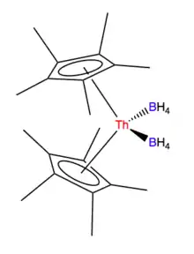 Another important thrust in her research involved the development of redox chemistry with uranium hydrides.[12] She showed that phenylsilane can be used as a convenient stoichiometric reagent producing well-defined uranium (III), uranium (IV), and uranium (VI) complexes.[14][12] Her more recent work details a new route to uranium and thorium metallocene borohydrides. The uranium complex had been synthesized previously from tetravalent uranium pentamethylborohydride and potassium cyclopentadiene, but the new synthesis using calcium borohydride and pentamethylcyclopentadienyl uranium chloride resulted in a higher yield under milder conditions.[15] While the preparation of U(BH4)4 is dated to the seminal work of Schlesinger and Brown in 1940s, this is the first example of a thorium metallocene borohydride.[15]