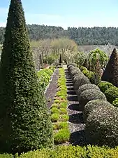 The lower terrace features fruit trees, particularly old varieties of apples and pears. The garden also has a garden of herbs, a collection of asters, and boxwood hedges trimmed in ornamental forms.