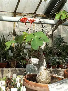 J. podagrica is a caudiciform perennial herb growing up to 1 metre (3 feet) tall.[4][5][6] The grey-green, knobby, swollen caudex has a bottle-like appearance, giving rise to some of the common names. Leaves are held on long fleshy yet stout petioles which emerge from the tip of the stem and radiate in all directions. Leaves are peltate and 3 or 5 lobed. Dense clusters of small, orange-red, flowers are held above the leaves on long slim peduncles. The clusters carry both male and female flowers and flowering continues for most of the year.[4][5][8] Fruit are green capsules at first, becoming blackish-brown at maturity, when they explode and scatter their seeds up to 4 metres (13 feet) away.[5][6]