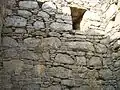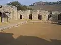 The monastery at Jaulian is similar to that of nearby Mohra Muradu.[3] Jaulian monastery was a two-level building that contained 28 students' rooms on the first floor, and 28 more on the second floor. The two levels are connected by stone stairs which are still preserved. Some of the rooms contain preserved statues of the Buddha. Each room had a niche to hold lamps, and a window offering a source of fresh air and natural light. The windows were designed to be narrower at the outer edge, of and larger at the inner edge in order guard against wild animals. The rooms were plastered and decorated with plasterwork and paintings.